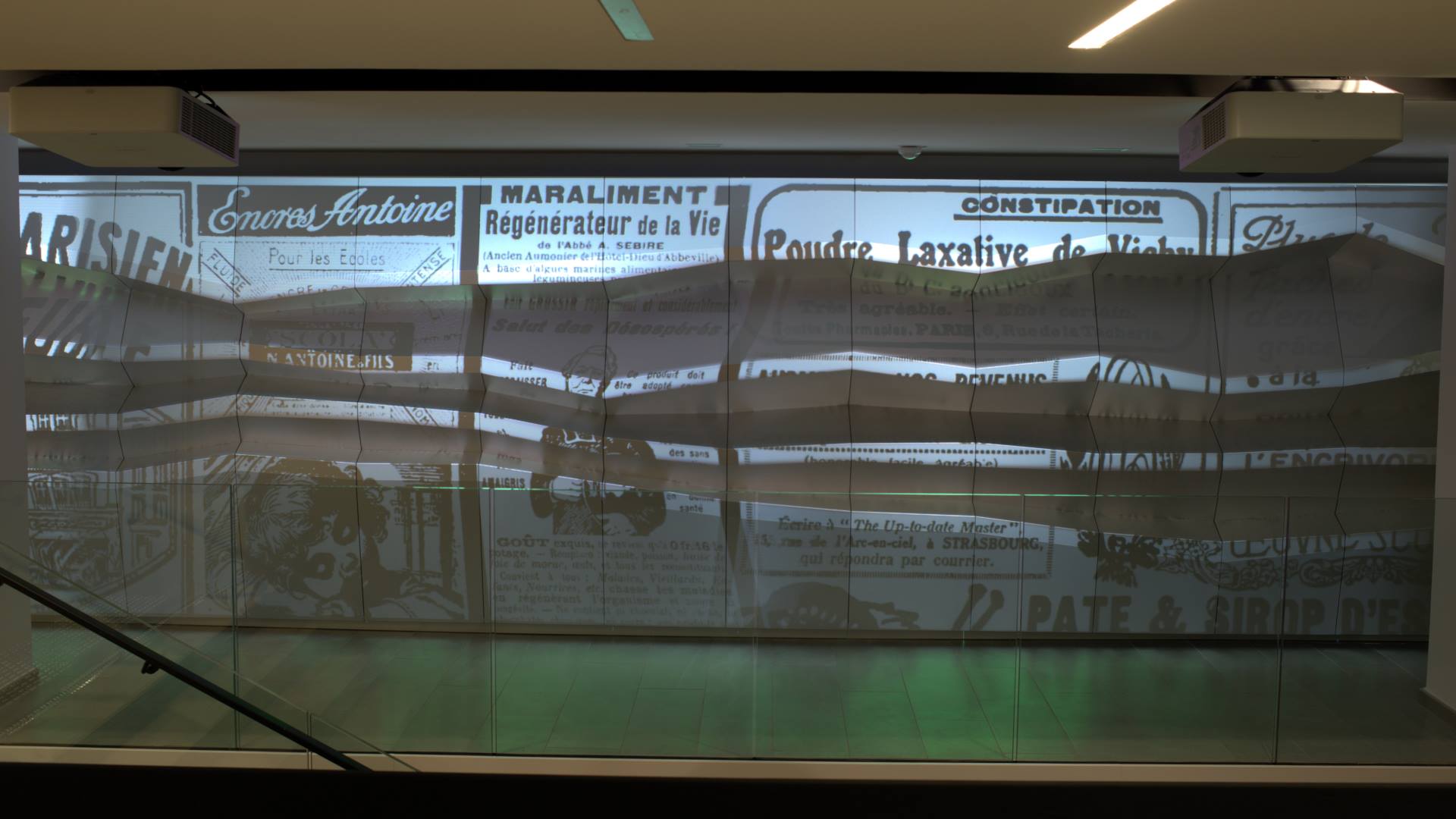 Des éléments typographiques vidéoprojetés semblent habiter dans ces volumes en relief. Nous serions en 2150 et nous verrions ces éléments textuels comme une mise à distance qu’on pourrait qualifier de rétro-fiction. Dans une logique de marqueur, les textes sont une invitation à parcourir la langue à travers le temps. Trois temporalités s’articulent : passé, présent et futur. Les éléments de textes autour du savoir sont collectés à partir d’archives de la Bibliothèque Nationale de France, de prélèvements d’écrits actuels et de fiction.