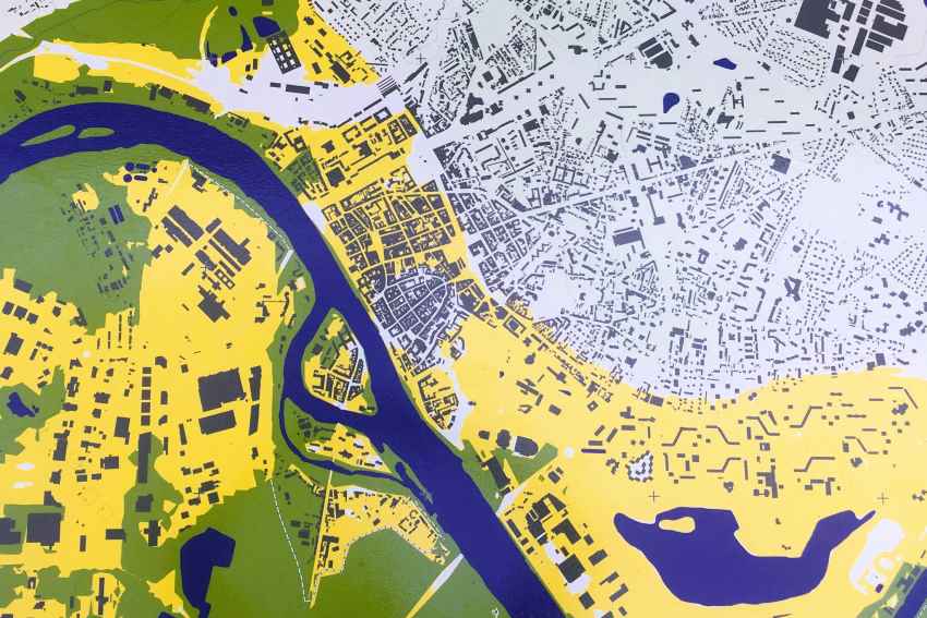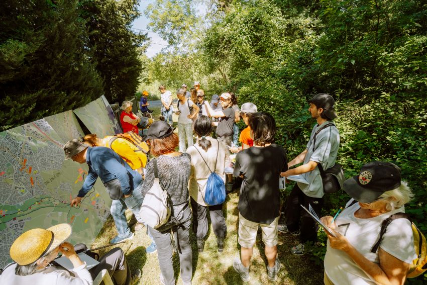 Exposées dans l'espace public, des cartes des risques du territoire montrent le bassin hydrographique. De grandes tables scénographient l'espace et deviennent un outil de médiation pour permettre l'échange avec le public sur le risque inondation.