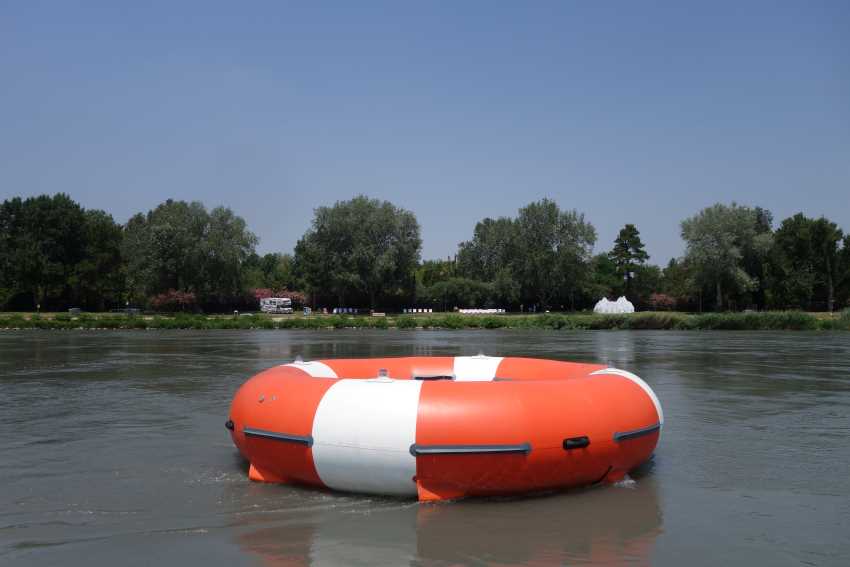 Une sculpture flottante à grande échelle, une bouée de sauvetage surdimensionnée qui agit comme un signal d'alerte, un élément d'assistance reconnaissable par les populations riveraines.