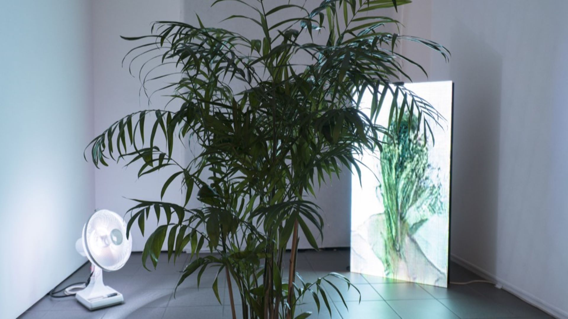 L’installation interroge la beauté et la brutalité des interconnexions présentes dans la nature. Un micro environnement de deux objets et un être vivant a été mis en place, inspiré par diverses symbioses et parasitages dans lesquels l’imitation et le mimétisme jouent un rôle crucial. Il est constitué d’une plante tropicale, d’un ventilateur modifié et d’un écran LED de basse résolution.