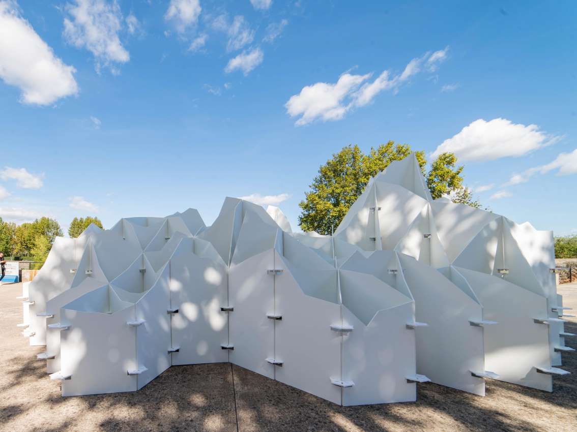 Il déploie ici une vague sculpturale inspirée des trames informatiques 3D et de la data visualisation. La texture de la houle nous projette dans un paysage mental où la puissance souveraine de l'eau, capable de submerger les territoires et les aménagements, aurait été figée. Ce scénario catastrophe mis en pause s'observe sans risque, il révèle ses reliefs sous différents points de vue.